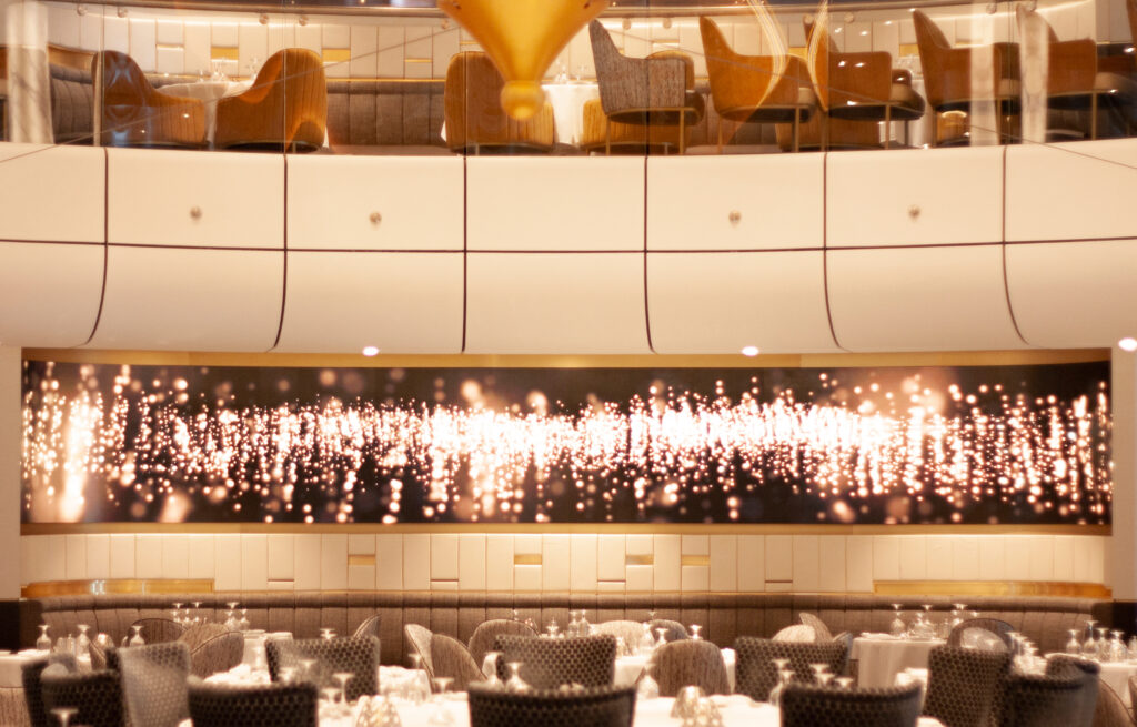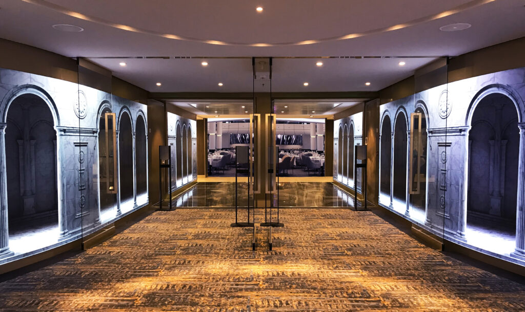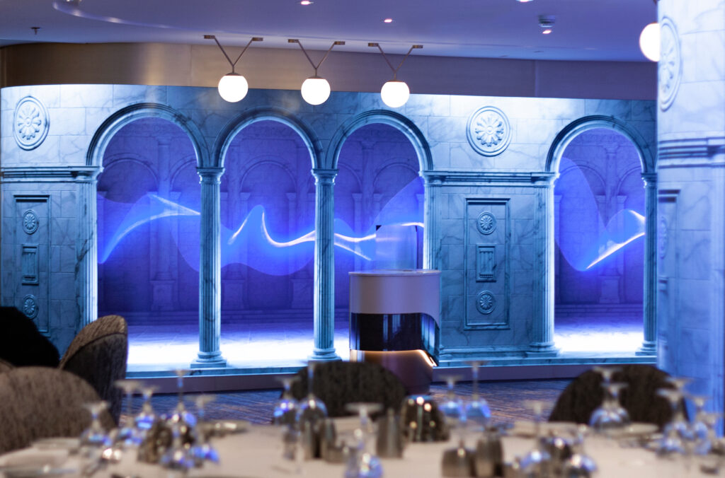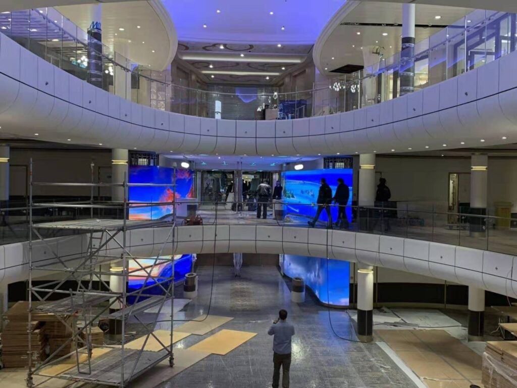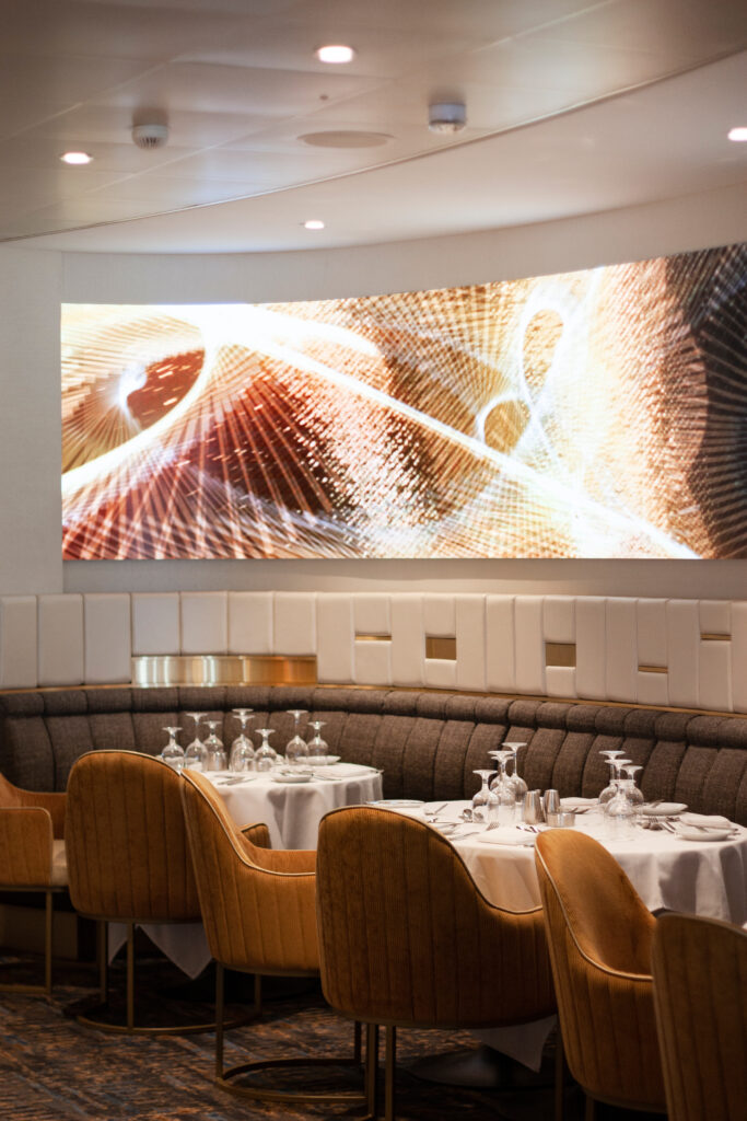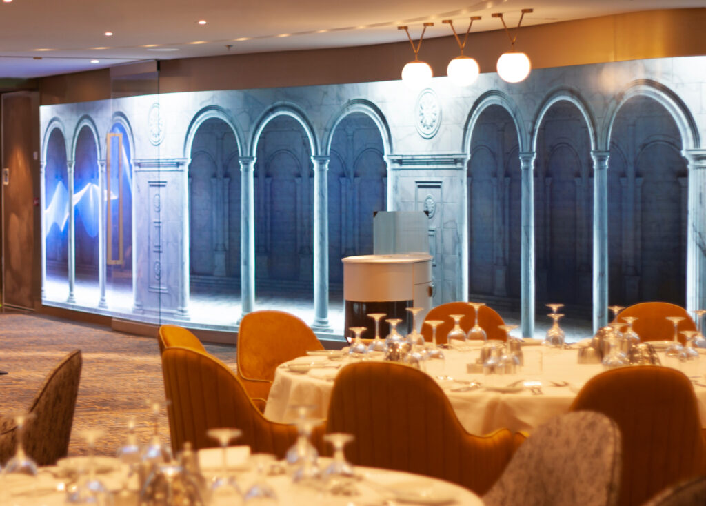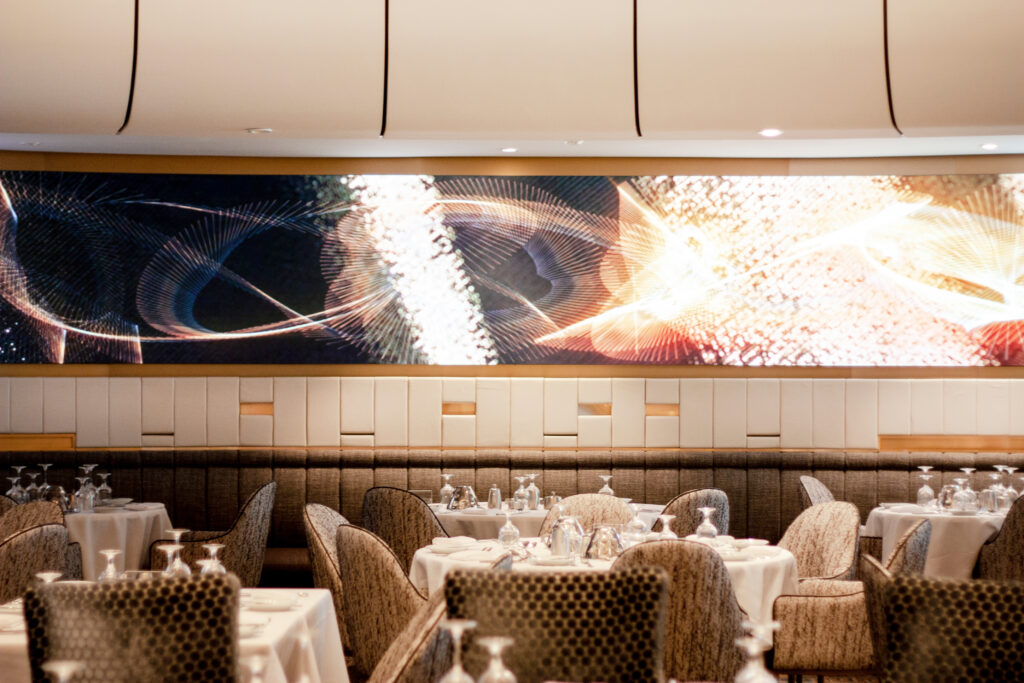 On Royal Caribbean ‘Spectrum of the Seas’, Unilumin’s flexible LED solution creates an amazing atmosphere for the entrances of the Main Dining Room of Deck 4 and Deck 5 as well as inside the venue, and the total screen area is 155sqm.